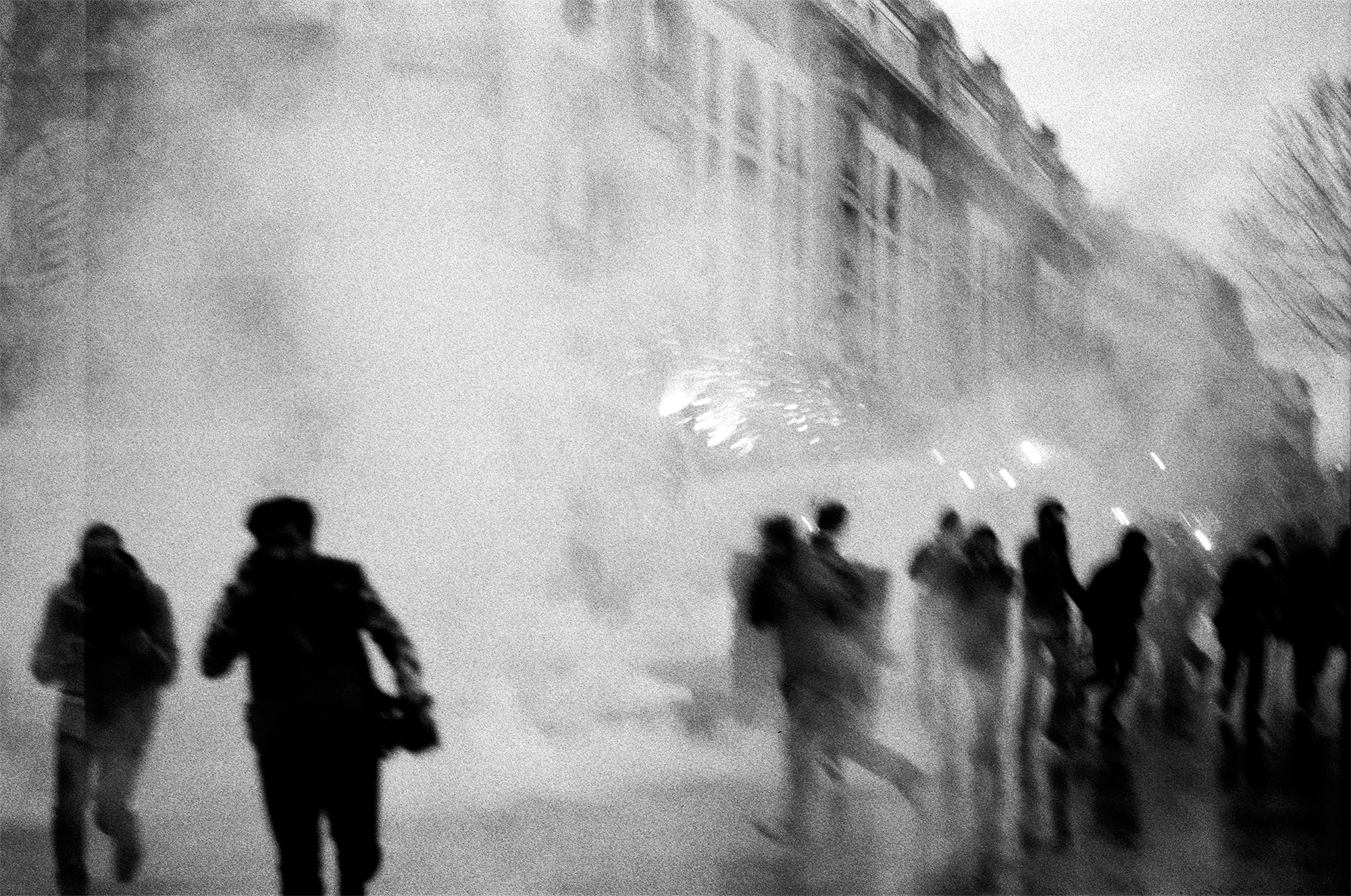 Par elle je tente de témoigner des scènes d'affrontements qui mettent en situation les moyens déployés pour se maintenir à distance. J'essaie de retranscrire l'atmosphère particulière des confrontations et les tensions perceptibles durant les instants qui les accompagnent.